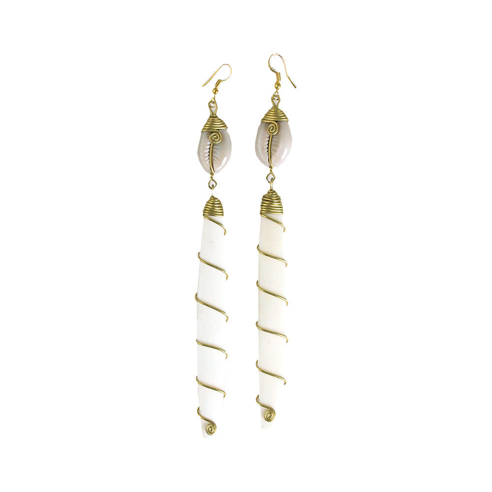 Dramatic and bold, these shoulder-length statement earrings make a unique addition to any ensemble! The stunning milky white bone earrings are long, cylindrical, and artfully wrapped with brass.