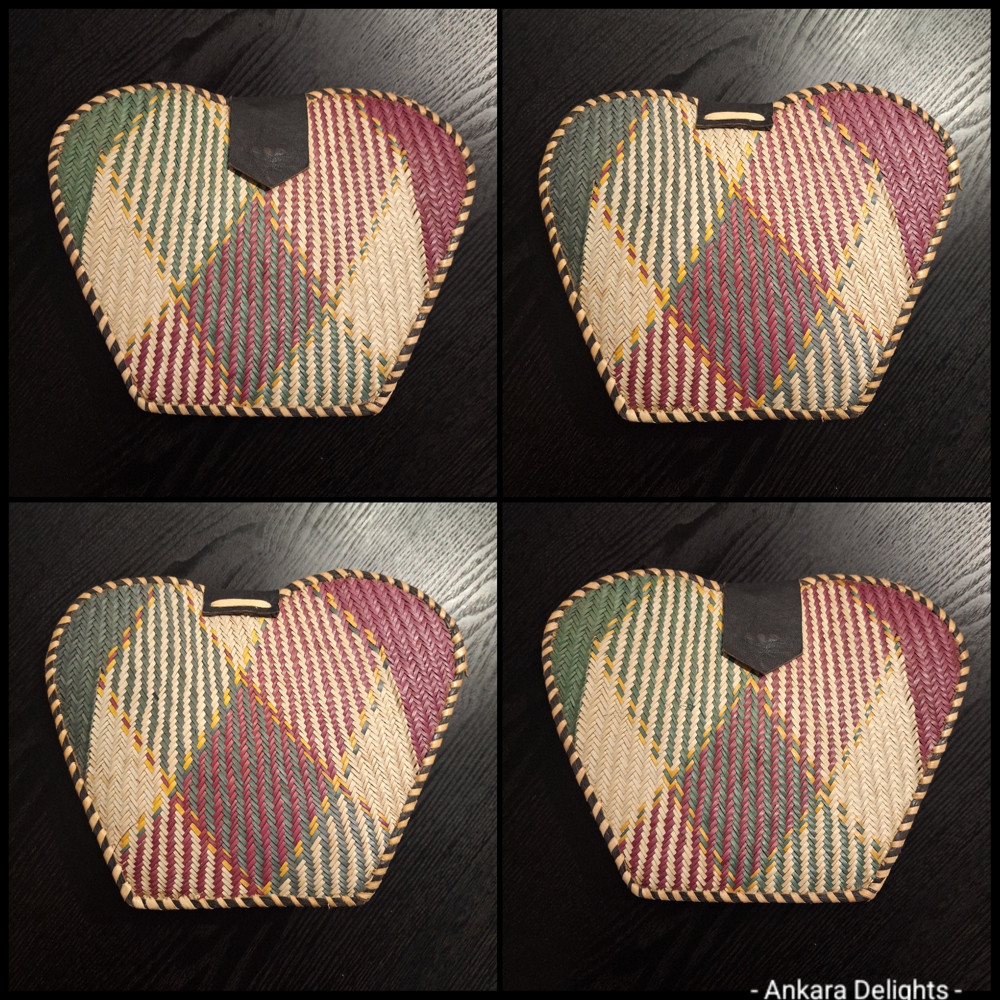 A modern take on age-old craftsmanship, these hand woven bags are distinct, fun, & complement your wardrobe all year long! Each raffia & leather bag has a unique design with a mix of modern and traditional African aesthetics and its heart-shape design is sure to catch the eye. No two are exactly alike!