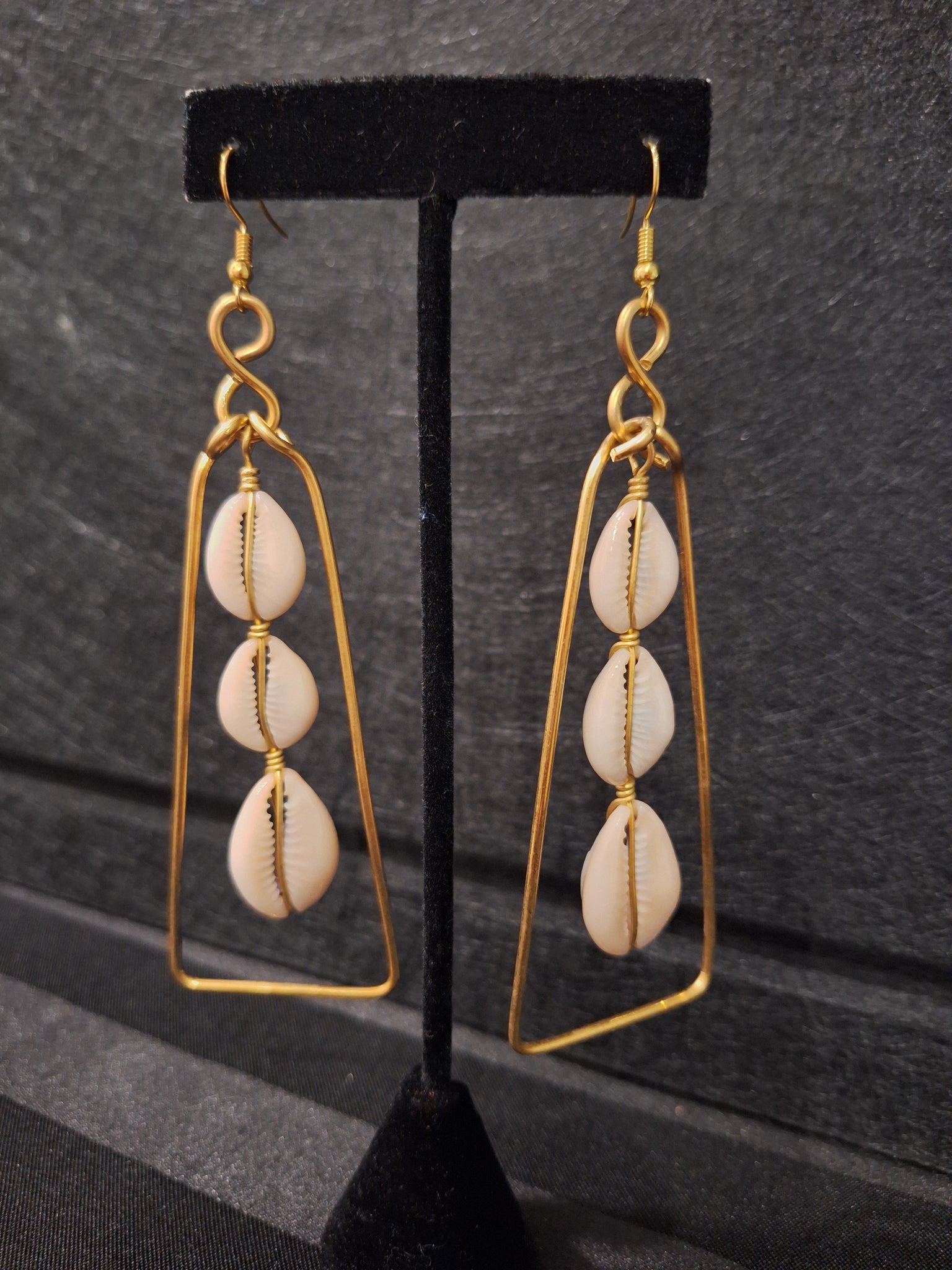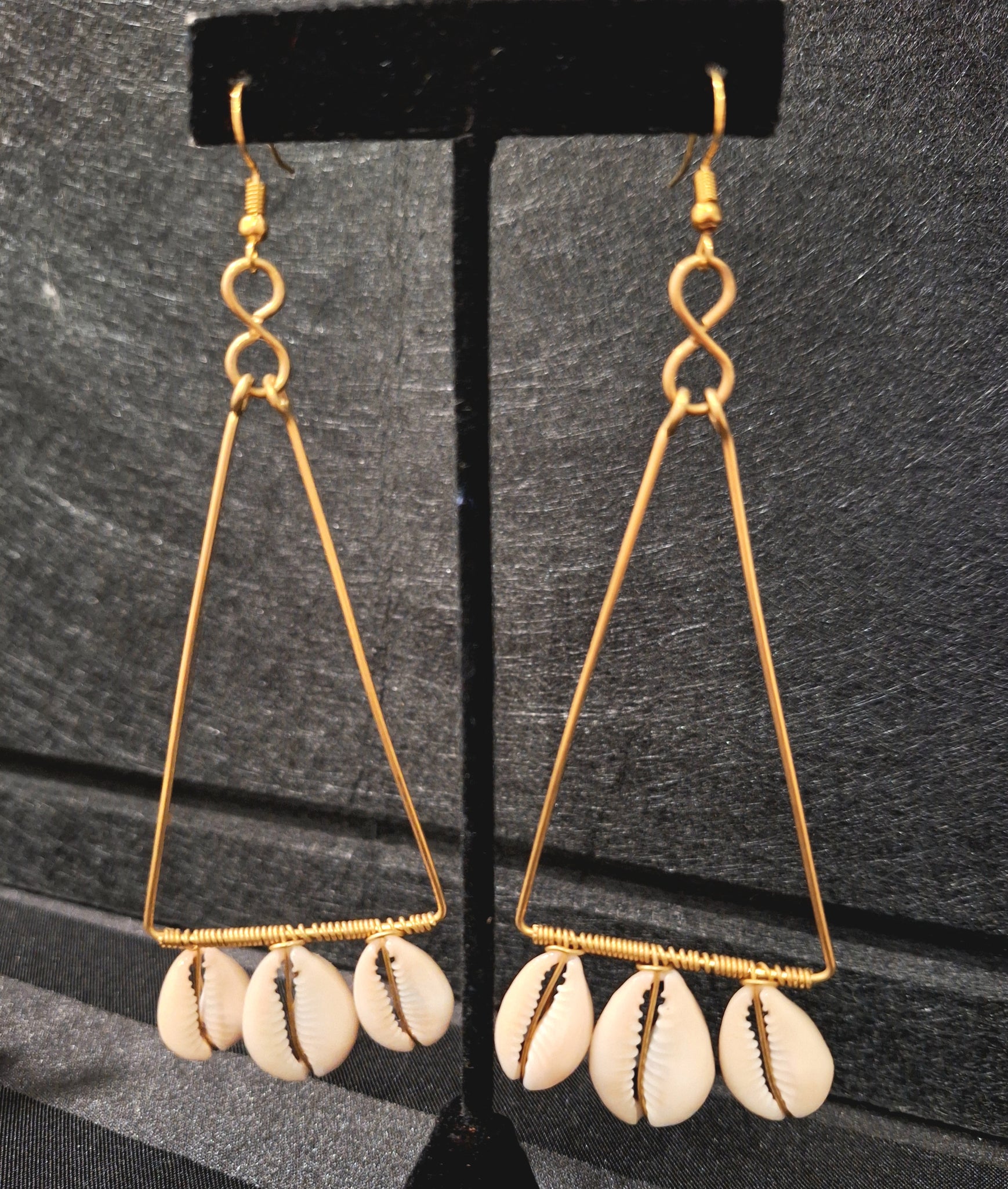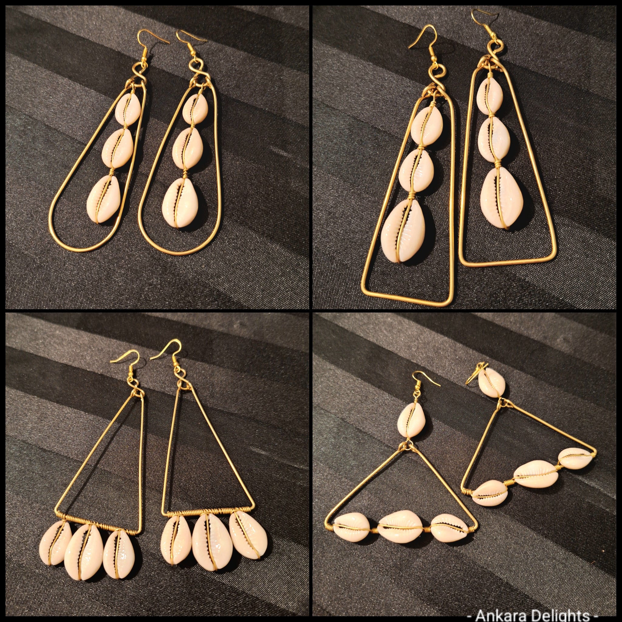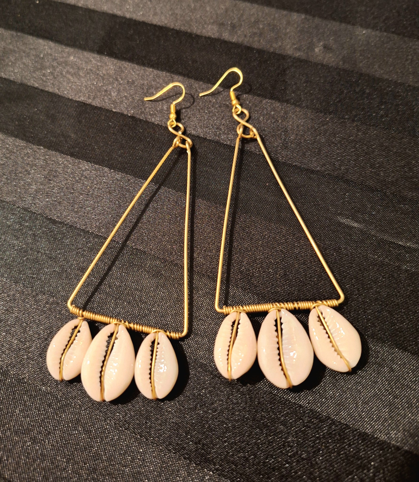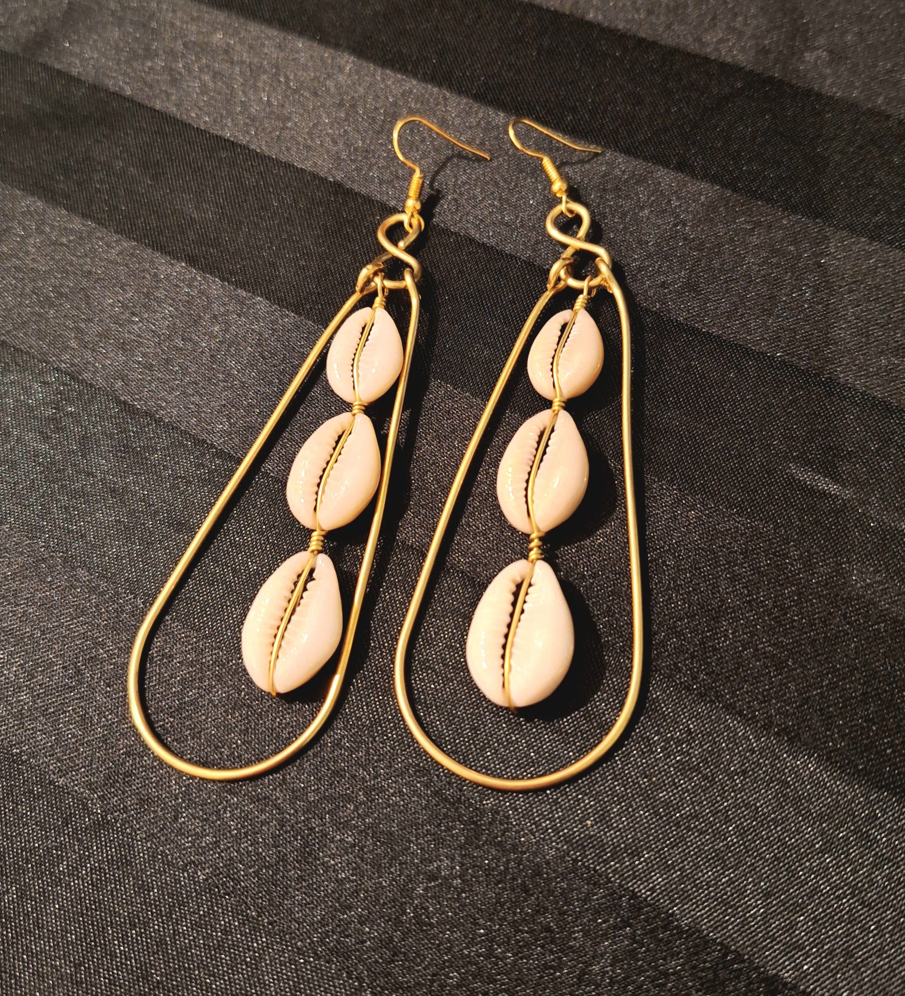 These Kenyan statement earrings make a stylish addition to any outfit! Hand-crafted by talented artisans, each pair features natural cowry shells embellished with golden brass wire.