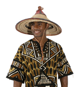 The trademark hat of the Fulani people of West Africa is a distinct collector's item with great cultural significance. Featuring a beautifully, hand-crafted combination of genuine reddish & black leather, tan straw, and cloth embellishments. No two are exactly alike!